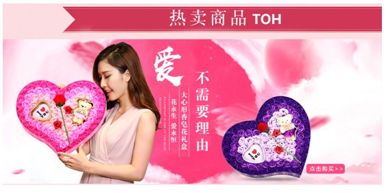 图3中,同样是经过装修的七夕节的版面,利用玫瑰花瓣和粉色系搭配,烘托出了节日的浪漫氛围。可见大多数卖家们对于节日的重视程度还是很高的。下面我们来分析一下,关于七夕这个浪漫的节日应该对店铺做哪些优化?