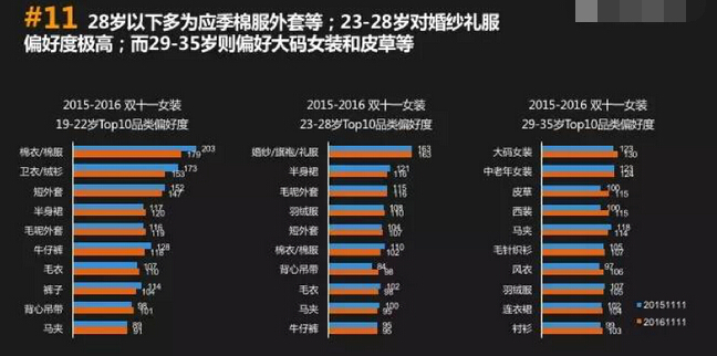 从数据维度来说,女生对于自身穿衣风格的定型节点发生在23到28岁,虽然之后会有一定变化,但是主线可能是比较稳定的。年轻人19到35岁,他们在品类偏好上差的很多。所以要强调,投放圈年龄是很重要的。